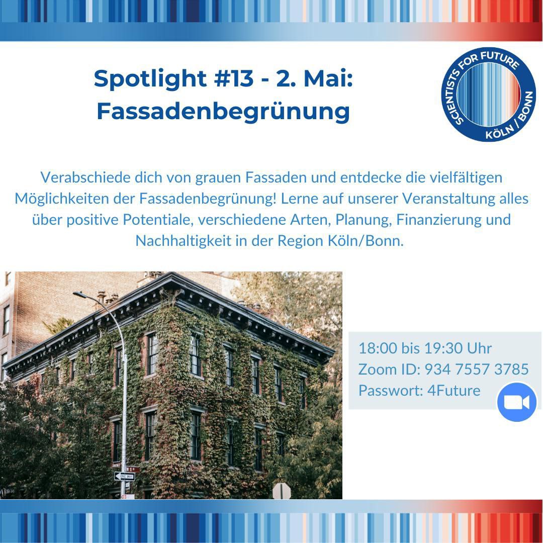 Diskutieren kannst du mit den Gästen Wibke Niels, Projektkoordinatorin am Institut für Biologiedidaktik der Universität zu Köln, und Prof. Dr. Hans G. Edelmann, Botaniker und Forscher am Institut für Biologiedidaktik der Universität zu Köln, über verschiedene Arten der Begrünung, die Planung (Dämmung und Kletterhilfen), finanzielle Förderung in der Region Köln/Bonn, Pflanzung und Bewässerung mit Regenwasser sowie den langfristigen Erhalt von Fassade und Pflanzen.