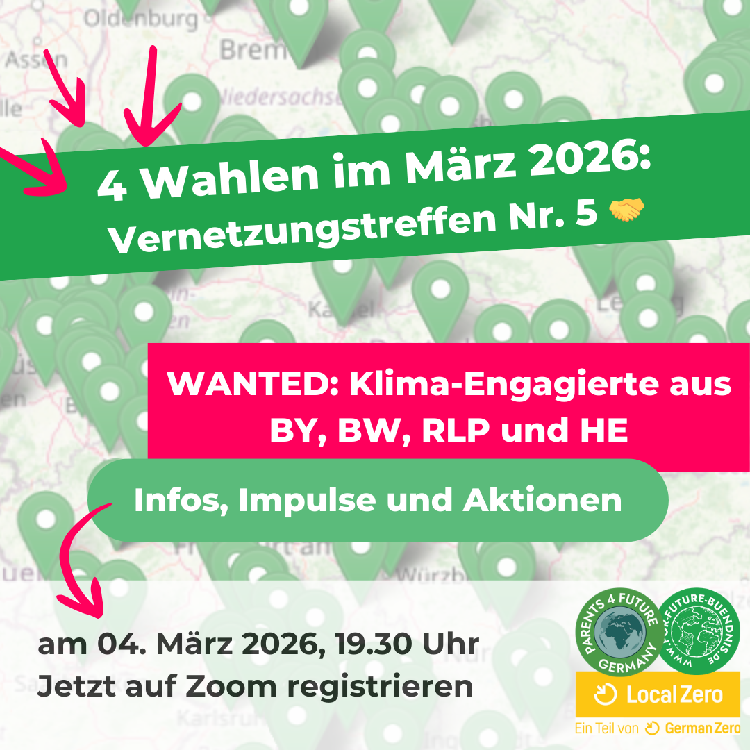Deshalb trommeln wir bereits zum 5. Mal alle Klima-Aktiven in den 4 Bundesländern Bayern, Baden-Württemberg, Hessen und Rheinland-Pfalz mit Wahlen im März 2026 zusammen.