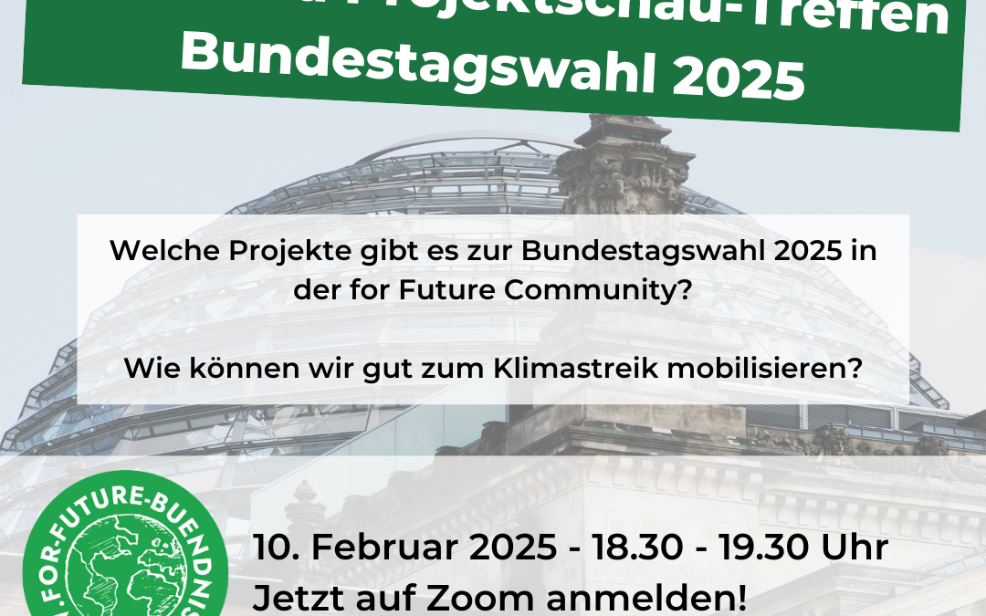 Mit dem Mobi- und letzten Projektschau-Treffen möchten wir euch einen letzten Überblick über die bestehenden Projekte zur Bundestagswahl verschaffen sowie mit euch kräftig für den Klimastreik am 14.02. mobilisieren!